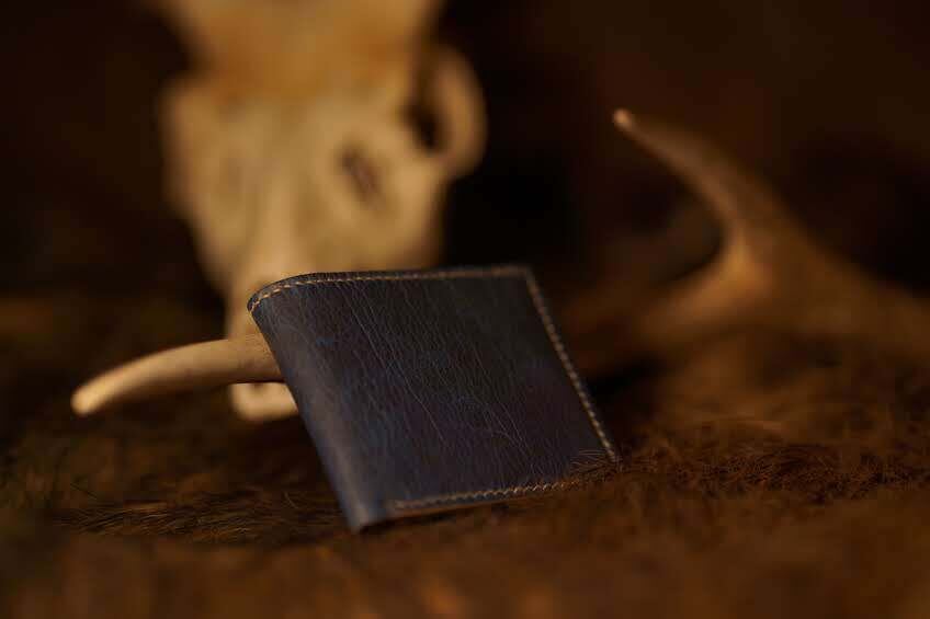 私が捕獲した鹿を最大限利活用し命に感謝し完成した鹿革を藍染した2つ折りの財布です。